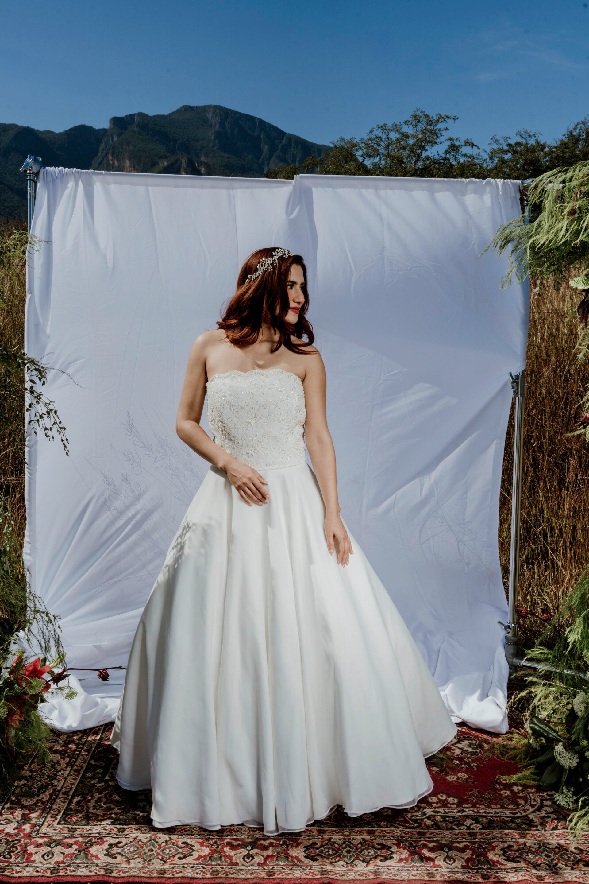 Clásico y romántico con silueta A-line que estiliza cualquier figura. El corset presenta un delicado bordado floral con pedrería nacarada que aporta brillo sútil y un acabado muy femenino.