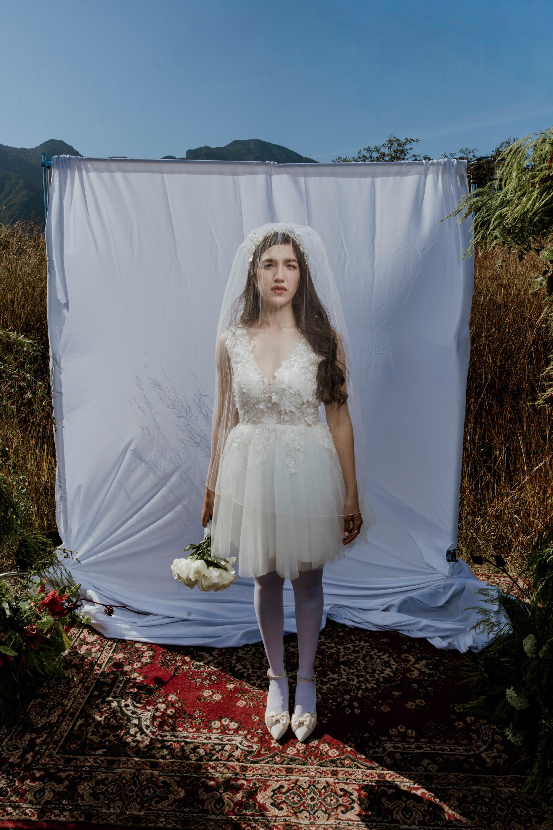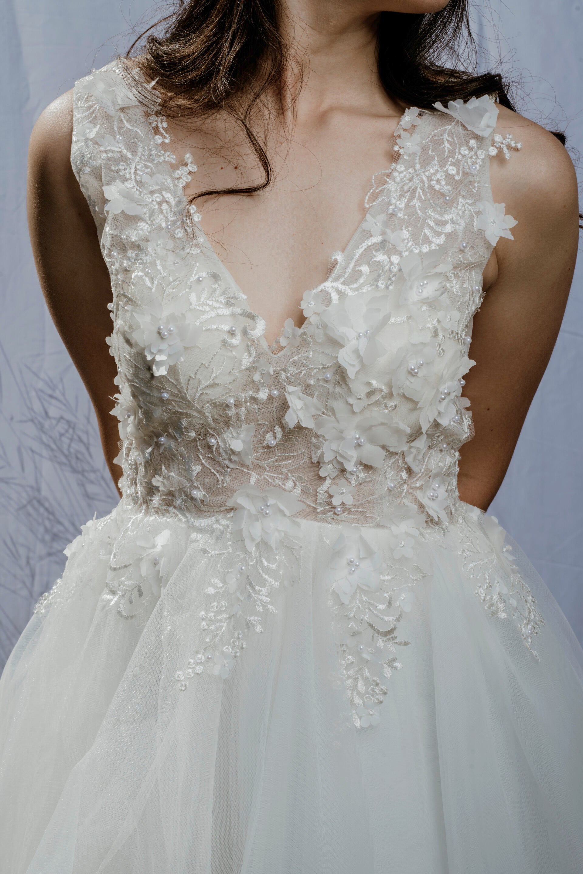 Un diseño contemporáneo lleno de frescura y romanticismo. Con escote en V y aplicaciones florales tridimensionales, este vestido mini es perfecto para novias modernas que buscan un look delicado pero con carácter.
