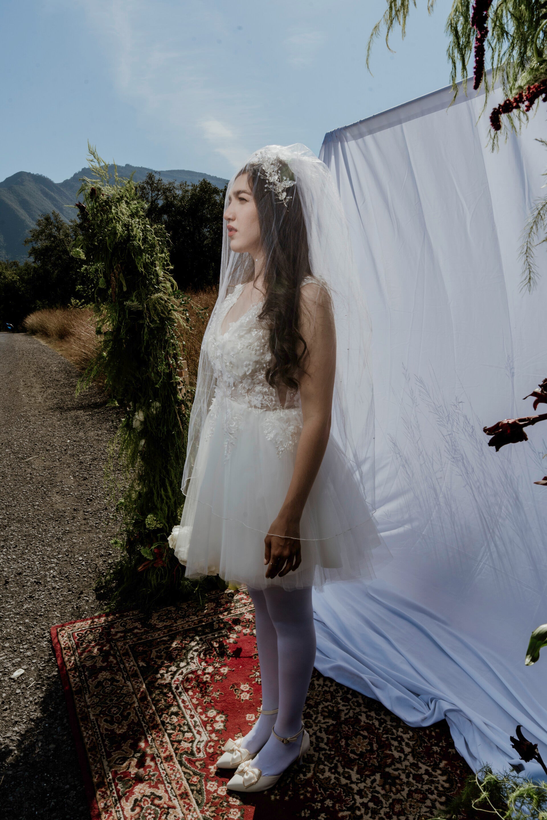 Su falda corta de tul en capas aporta movimiento y un estilo juvenil, ideal para boda civil, sesiones editoriales o como second dress.